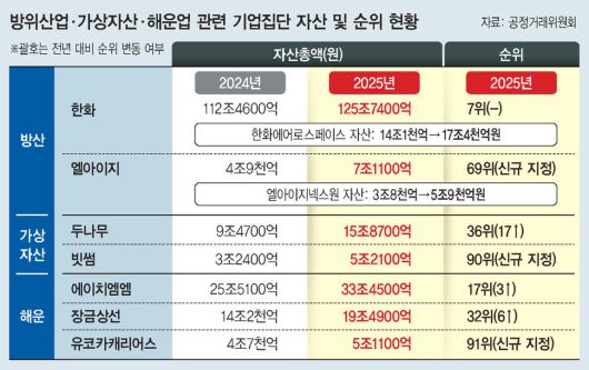방위산업, 가상자산(암호화폐), 해운업을 보유한 대기업집단의 자산이 지난해 크게 불어난 것으로 나타났다. 미국 도널드 트럼프 대통령의 당선 이후 통상 환경 등의 변화가 이들 기업집단 몸집을 불린 것이다. 김승연 한화그룹 회장과 이명희 신세계 총괄회장은 총수(동일인) 지위를 유지했고, 김범석 쿠팡 의장은 올해도 총수 지정을 피했다.