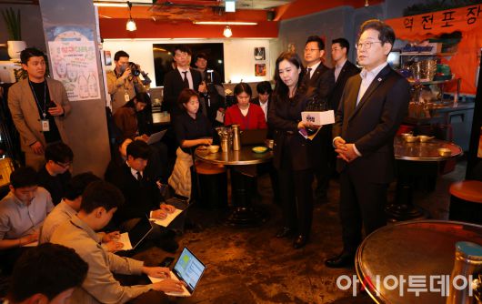 아시아투데이 이병화 기자 = 이재명 더불어민주당 대선 후보가 1일 오후 서울 종로구 삼일대로 한 식당에서 열린 민생시리즈2 <비전형 노동자 간담회>를 마치고 대법원이 공직선거법 위반과 관련한 2심 판결을 파기 환송한데 대한 기자의 질문에 답하고 있다.