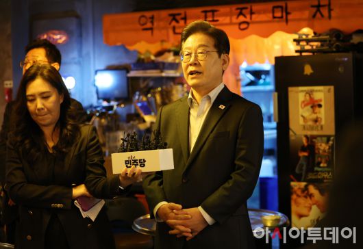 아시아투데이 이병화 기자 = 이재명 더불어민주당 대선 후보가 1일 오후 서울 종로구 삼일대로 한 식당에서 열린 민생시리즈2 <비전형 노동자 간담회>를 마치고 대법원이 공직선거법 위반과 관련한 2심 판결을 파기 환송한데 대한 기자의 질문에 답하고 있다. ⓒ "젊은 파워, 모바일 넘버원 아시아투데이"