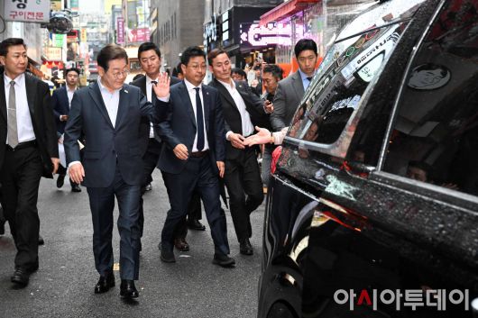 아시아투데이 이병화 기자 = 이재명 더불어민주당 대선 후보가 1일 서울 종로구의 한 음식점에서 열린 비전형 노동자 간담회 종료 후 차량으로 이동하며 지지자들에게 인사하고 있다. 대법원 전원합의체는 이날 이 후보에게 무죄를 선고한 원심판결을 파기하고 사건을 서울고법으로 돌려보냈다.