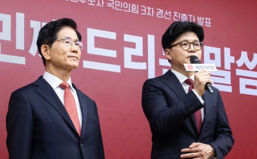 제21대 대통령후보자 국민의힘 3차 경선 진출자로 확정된 한동훈 후보(오른쪽)가 29일 오후 서울 여의도 국민의힘 중앙당사에서 소감을 말하고 있다. 뉴스1 |