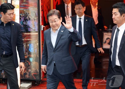 (서울=뉴스1) 이재명 기자 = 이재명 더불어민주당 대통령 후보가 1일 서울 종로구의 한 포차 식당에서 '당신의 하루를 만드는, 보이지 않는 영웅들'이란 주제로 열린 배달 라이더, 택배 기사 등 비(非)전형 노동자들과 간담회를 마친 뒤 나서며 손인사를 하고 있다. (공동취재) 2025.5.1/뉴스1