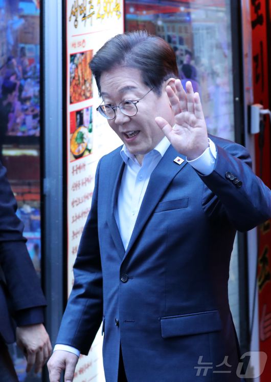 (서울=뉴스1) 이재명 기자 = 이재명 더불어민주당 대통령 후보가 1일 서울 종로구의 한 포차 식당에서 \'당신의 하루를 만드는, 보이지 않는 영웅들\'이란 주제로 열린 배달 라이더, 택배 기사 등 비(非)전형 노동자들과 간담회를 마친 뒤 나서며 손인사를 하고 있다. (공동취재) 2025.5.1/뉴스1