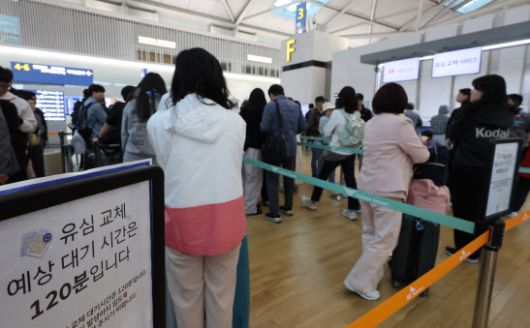 5월 1일부터 엿새간 이어지는 황금연휴를 앞둔 30일 인천국제공항 제1여객터미널 SK텔레콤 로밍센터에서 출국자들이 유심 교체를 위해 대기하고 있다.(사진=연합뉴스) |