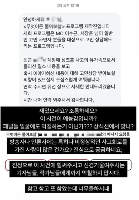 ‘물어보살’ 제작진이 A씨에게 보낸 메시지에는 “최근 OO님 계정에 싱크홀 사고의 유가족으로서 올리신 릴스 내용을 봤다”며 “혹시 이야기하신 내용에 대해 고민 상담 받아보실 의향이 있으실지 조심르럽게 여쭤본다”라는 내용이 담겼다.