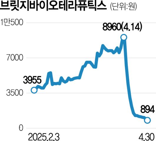 신약 개발에 문제가 생기며 주가가 급락한 바이오 기업 사례는 올 들어 속출하고 있다. 앞서 브릿지바이오테라퓨틱스(288330)는 특발성폐섬유증(IPF) 신약 후보 물질인 ‘BBT-877’의 임상 2상 톱라인(주요 지표)에서 유효성을 확보하지 못했다고 공시한 후 주가가 폭락했다. 매출이 거의 전무한 상황에서 신약 개발 실패 소식이 자금난 우려를 가중시켰다. 지난달 30일 종가 기준 브릿지바이오테라퓨틱스의 주가는 894원으로 지난달 14일 기록한 역대 최고가 8960원 대비 90% 넘게 하락했다. 올 3월부터 지난달까지 두 달 동안 브릿지바이오테라퓨틱스 주식 250억 원어치를 매수한 개인투자자들의 손실 규모도 함께 불어나고 있다.