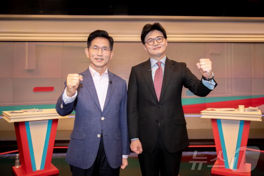 국민의힘 김문수(왼쪽), 한동훈 대선 경선 후보가 30일 오후 서울 중구 TV조선에서 열린 제21대 대통령 후보자 결승 토론회에 앞서 기념촬영을 하고 있다. 2025.4.30/뉴스1 ⓒ News1 국회사진취재단 |