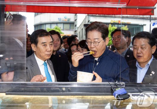 (서울=뉴스1) 이재명 기자 = 이재명 더불어민주당 대통령 후보가 1일 오후 경기도 포천시 신읍사거리 일대를 찾아 닭강정을 맛보고 있다. 2025.5.1/뉴스12expulsion@news1.krCopyright ⓒ 뉴스1. All rights reserved. 무단 전재 및 재배포, AI학습 이용 금지.
