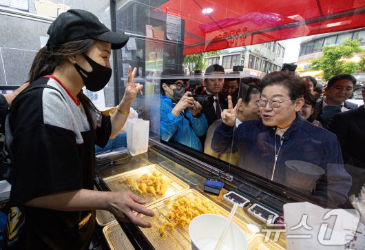 (포천=뉴스1) 이재명 기자 = 이재명 더불어민주당 대통령 후보가 1일 오후 경기도 포천시 신읍사거리 일대를 찾아 치킨집 사장과 대화를 하고 있다. 2025.5.1/뉴스12expulsion@news1.krCopyright ⓒ 뉴스1. All rights reserved. 무단 전재 및 재배포, AI학습 이용 금지.