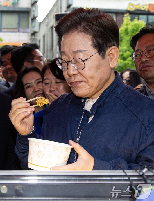 (포천=뉴스1) 이재명 기자 = 이재명 더불어민주당 대통령 후보가 1일 오후 경기도 포천시 신읍사거리 일대를 찾아 닭강정을 맛보고 있다. 2025.5.1/뉴스12expulsion@news1.krCopyright ⓒ 뉴스1. All rights reserved. 무단 전재 및 재배포, AI학습 이용 금지.