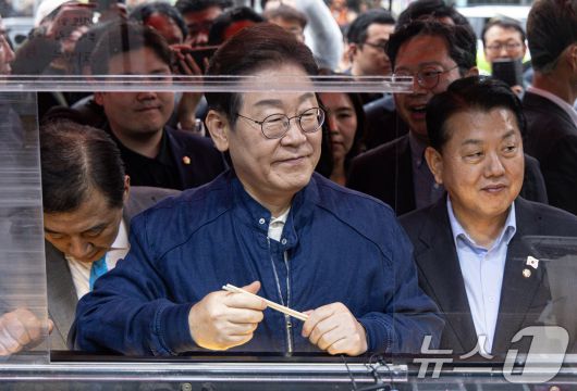 (포천=뉴스1) 이재명 기자 = 이재명 더불어민주당 대통령 후보가 1일 오후 경기도 포천시 신읍사거리 일대에서 주문한 닭강정을 기다리고 있다. 2025.5.1/뉴스12expulsion@news1.krCopyright ⓒ 뉴스1. All rights reserved. 무단 전재 및 재배포, AI학습 이용 금지.