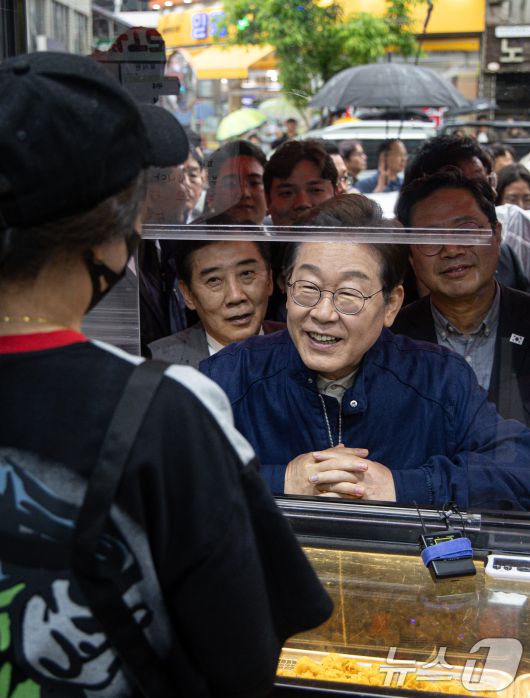 (포천=뉴스1) 이재명 기자 = 이재명 더불어민주당 대통령 후보가 1일 오후 경기도 포천시 신읍사거리 일대에서 치킨집 사장과 대화를 하고 있다. 2025.5.1/뉴스12expulsion@news1.krCopyright ⓒ 뉴스1. All rights reserved. 무단 전재 및 재배포, AI학습 이용 금지.