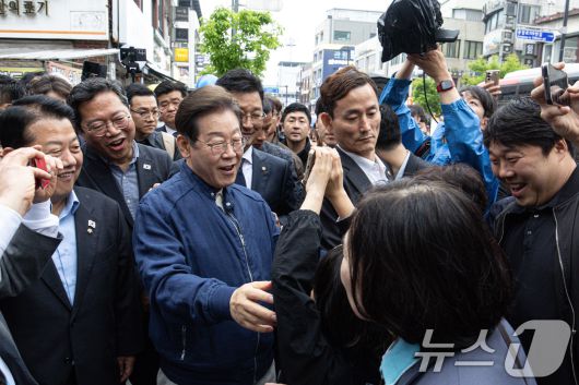 (포천=뉴스1) 이재명 기자 = 이재명 더불어민주당 대통령 후보가 1일 오후 경기도 포천시 신읍사거리 일대를 찾아 한 어린이가 스마트폰에 적은 글귀를 보고 있다. 2025.5.1/뉴스12expulsion@news1.krCopyright ⓒ 뉴스1. All rights reserved. 무단 전재 및 재배포, AI학습 이용 금지.
