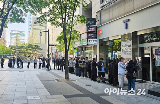 28일 오전 서울 마포구에 위치한 T월드 매장에 유심을 교체하러 온 SK텔레콤 고객들이 줄을 지어 서 있다. [사진=정소희 기자] |
