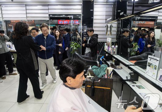 (연천=뉴스1) 이재명 기자 = 이재명 더불어민주당 대통령 후보가 1일 오후 경기도 연천군 전곡시외터미널 인근 미용실을 찾아 사장과 인사를 나누고 있다. 2025.5.1/뉴스12expulsion@news1.krCopyright ⓒ 뉴스1. All rights reserved. 무단 전재 및 재배포, AI학습 이용 금지.