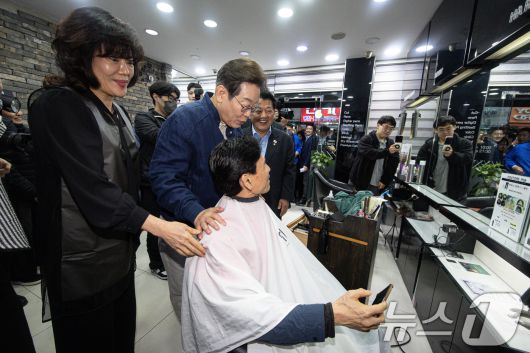 (연천=뉴스1) 이재명 기자 = 이재명 더불어민주당 대통령 후보가 1일 오후 경기도 연천군 전곡시외터미널 인근에 위치한 미용실을 찾아 시민과 대화하고 있다. 2025.5.1/뉴스12expulsion@news1.krCopyright ⓒ 뉴스1. All rights reserved. 무단 전재 및 재배포, AI학습 이용 금지.