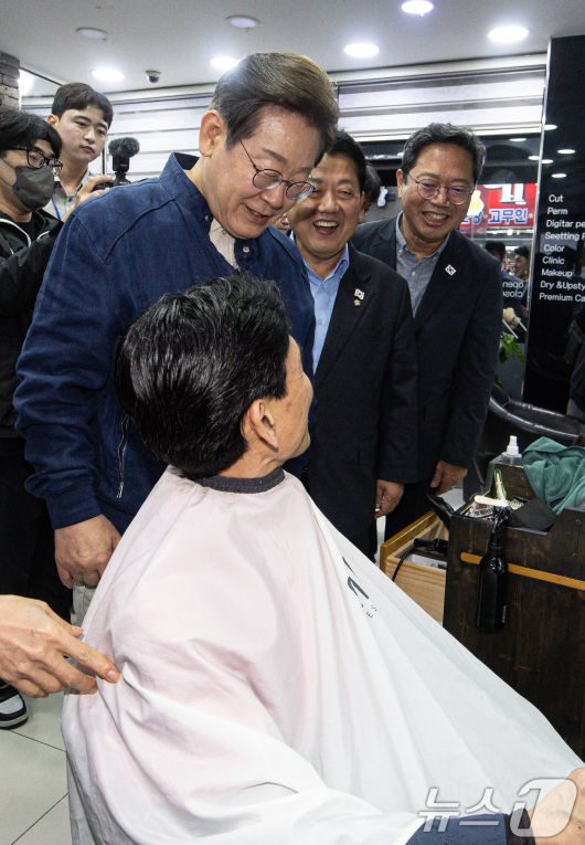 (연천=뉴스1) 이재명 기자 = 이재명 더불어민주당 대통령 후보가 1일 오후 경기도 연천군 전곡시외터미널 인근에 위치한 미용실을 찾아 시민과 대화하고 있다. 2025.5.1/뉴스1