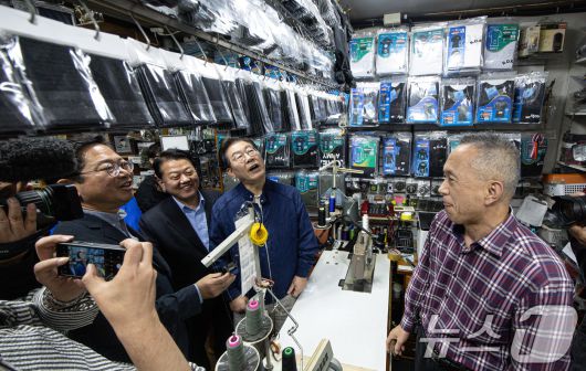 (연천=뉴스1) 이재명 기자 = 이재명 더불어민주당 대통령 후보가 1일 오후 경기도 연천군 전곡시외터미널 인근에 위치한 군장점을 찾아 상품을 살펴보고 있다. 2025.5.1/뉴스12expulsion@news1.krCopyright ⓒ 뉴스1. All rights reserved. 무단 전재 및 재배포, AI학습 이용 금지.
