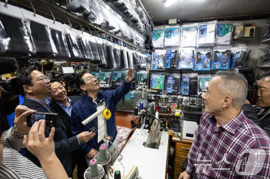 (연천=뉴스1) 이재명 기자 = 이재명 더불어민주당 대통령 후보가 1일 오후 경기도 연천군 전곡시외터미널 인근에 위치한 군장점을 찾아 상품을 살펴보고 있다. 2025.5.1/뉴스1
