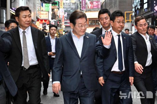 [서울=뉴시스] 조성우 기자 = 이재명 더불어민주당 대선후보가 1일 오후 서울 종로구의 한 포장마차에서 열린 비전형 노동자 간담회를 마치고 이동하며 지지자들에게 인사하고 있다. 대법원 전원합의체는 이날 이 후보에게 무죄를 선고한 원심 판결을 파기하고 사건을 서울고법으로 돌려보냈다. (공동취재) 2025.05.01. photo@newsis.com |