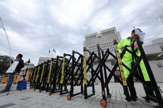 이재명 더불어민주당 대선 후보의 공직선거법 위반 혐의에 대한 상고심이 열린 1일 서울 서초구 대법원 정문 앞에 경찰 바리케이드가 설치돼 있다. 대법원은 이날 인가된 차량 외 출입을 막고 도보 출입도 통제했다. 뉴스1 |