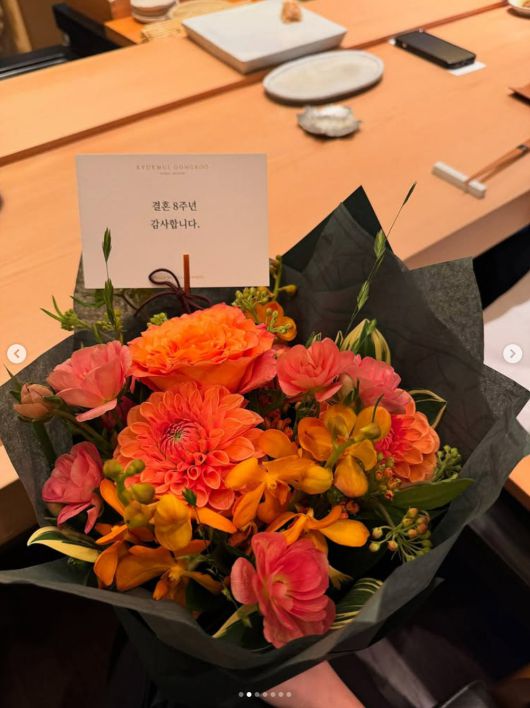 함께 게시한 사진 속 김소영, 오상진 부부는 결혼 8주년을 맞아 고급스러운 식당을 찾았다. 김소영은 '결혼 8주년 감사합니다'라는 메시지 카드가 꽂힌 꽃다발을 안고 행복한 미소를 짓고 있다. 변함없이 금슬 좋은 부부의 모습이 훈훈함을 자아낸다.