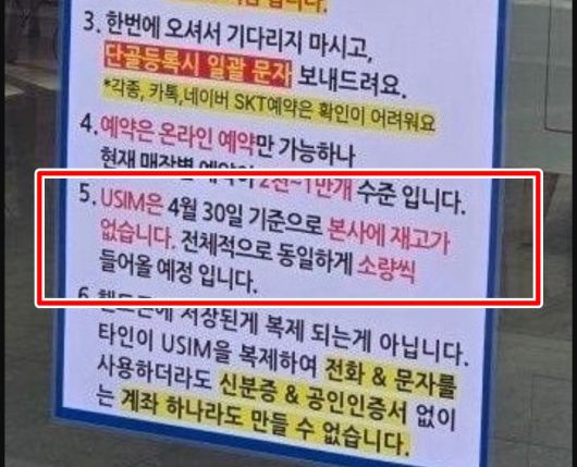 대표적인 게 최근 온라인 커뮤니티에서 회자된 SKT 대리점 게시글이다. 해당 게시글에는 “유심은 4월 30일 기준으로 본사에 재고가 없다”며 “전체적으로 동일하게 소량씩 들어올 예정”이라는 내용이 담겨 있다.