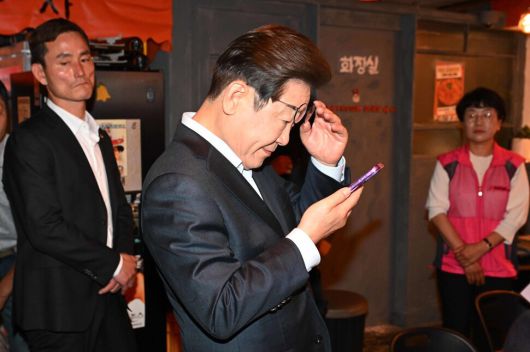 더불어민주당 이재명 대선 후보가 1일 서울 종로구의 한 포차 식당에서 \'당신의 하루를 만드는, 보이지 않는 영웅들\'이란 주제로 배달 라이더, 택배 기사 등 비(非)전형 노동자들과 간담회를 마친 뒤 휴대전화를 확인하고 있다. 공동취재사진 |