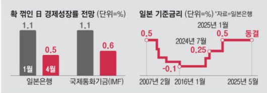 일본 중앙은행인 일본은행이 기준금리를 동결했다. 도널드 트럼프 미국 대통령의 관세정책에 따른 불확실성이 높아지면서 올해 실질 국내총생산(GDP) 성장률 전망치도 절반으로 낮췄다.