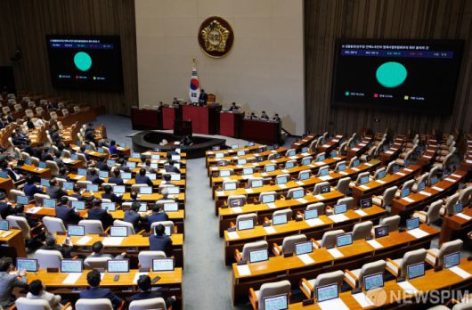 [서울=뉴스핌] 윤창빈 기자 = 1일 오후 서울 여의도 국회에서 열린 본회의에서 검찰총장(심우정) 탄핵소추안의 법제사법위원회로의 회부 동의의 건이 가결되고 있다. 2025.05.01 pangbin@newspim.com |