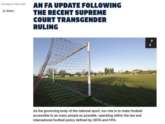 FA도 몇 주만에 규정 검토에 들어갔다. 'BBC'는 지난 30일 "잉글랜드축구협회가 몇 주 전 내린 성전환 여성의 여자축구 출전 허용 결정을 신중히 재검토하고 있다. 법적 자문을 받고 있다"고 전했다. 그리고 FA 또한 성전환 여성이 여자 축구 출전 금지를 확정했다.