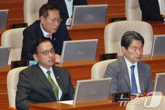 최상목 경제부총리 겸 기획재정부장관과 이주호 사회부총리 겸 교육부장관이 1일 오후 서울 여의도 국회에서 열린 본회의에 출석해 있다. 2025.5.1/뉴스1 ⓒ News1 이광호 기자 |