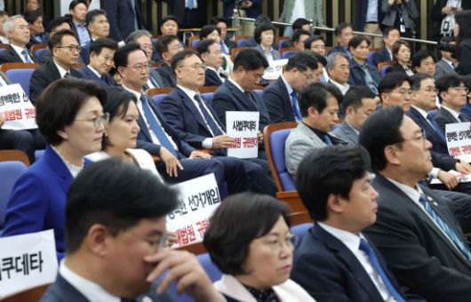 법원이 더불어민주당 이재명 대선후보의 공직선거법 위반 혐의 2심 무죄판결을 파기 환송한 1일 서울 여의도 국회에서 열린 민주당 긴급의원총회에서 의원들이 굳은 표정을 짓고 있다. 연합뉴스 |