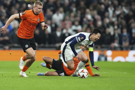 프랑크푸르트와 유로파리그 8강 1차전에서 깊은 태클에 걸려 넘어지는 손흥민. [AP=연합뉴스] |
