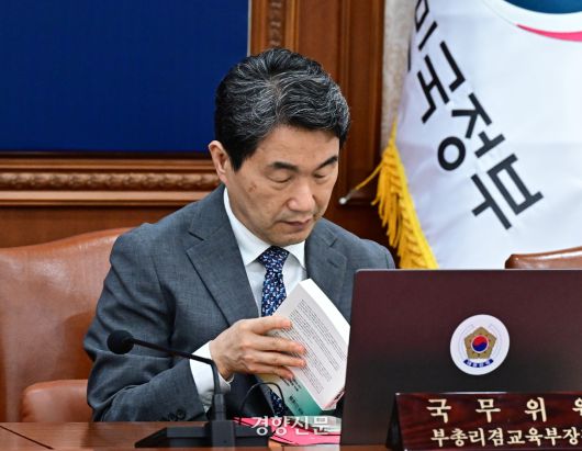 이주호 교육부 장관이 지난달 22일 서울 종로구 정부서울청사에서 열린 국무회의에서 선물 받은 책을 살펴보고 있다. 대통령실사진기자단 |