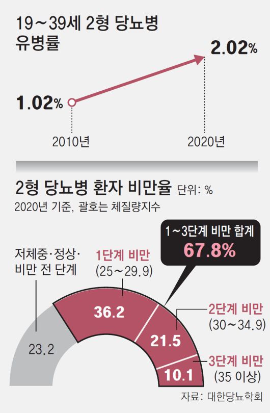 비만과 청년 당뇨병 증가의 연관성은 뚜렷하다. 논문에 따르면 청년 당뇨 환자 중 과체중 환자가 정상 체중 환자보다 많았다. 강재헌 강북삼성병원 가정의학과 교수는 “비만이 증가하면서 당뇨 발병률도 높아지고 있다”며 “체중 조절만 성공해도 증상이 개선된다”고 말했다.