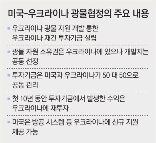 두 나라는 재건 기금을 5 대 5의 비율로 공동 관리하기로 했다. 미국의 기존 군사 지원에 대한 보상 방안, 전쟁 후 러시아가 점령 중인 우크라이나 남동부 자포리자 원자력발전소의 운영 및 소유권을 미국이 넘겨받는 방안 등은 협정에 포함되지 않은 것으로 알려졌다.