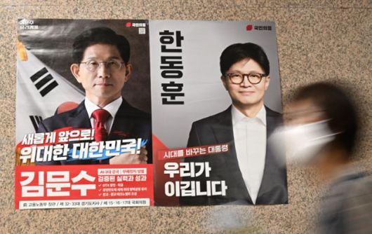 30일 국회 본청 복도에 김문수(왼쪽), 한동훈 국민의힘 대선 경선 후보의 포스터가 붙어 있다. 고영권 기자 |