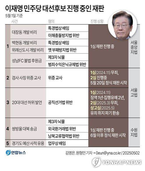 1일 법조계에 따르면 이 후보는 이날 대법원에서 파기환송 판결이 내려진 공직선거법 위반 사건을 포함해 모두 5개 재판의 피고인 신분이다.