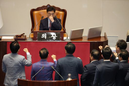 국민의힘 의원들이 1일 오후 국회 본회의에서 최상목 경제부총리 겸 기획재정부 장관 탄핵소추안을 상정하는 우원식 국회의장에게 구호를 외치며 항의하고 있다. 뉴스1 |