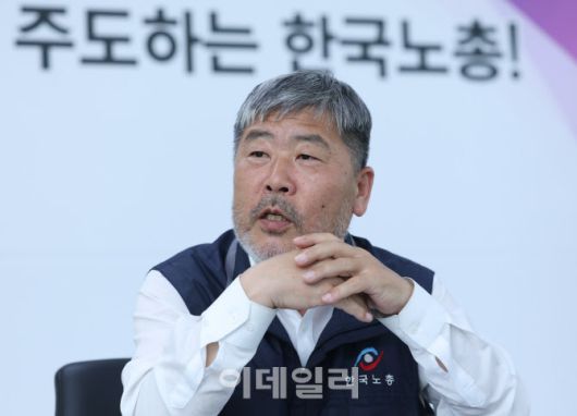 [이데일리 노진환 기자] 김동명 한국노동조합총연맹 위원장이 지난 4월 21일 서울 영등포구 여의도동 한국노총에서 이데일리와 인터뷰를 하고 있다. |