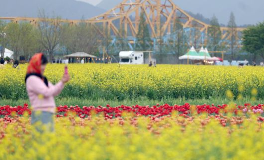 경남 창녕군 남지읍 창녕 낙동강 유채단지에서 상춘객이 봄기운을 만끽하고 있다. 연합뉴스 |