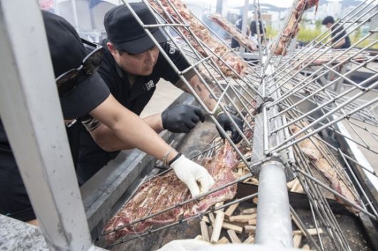 지난해 10월10일 서울 송파구 가락몰 3층 하늘공원에서 서울시농수산식품공사 주최로 ‘가락 옥토버페스트’가 열린 가운데 관계자들이 바비큐를 굽고 있다. 서울시농수산식품공사 제공 |
