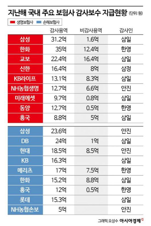 지난해 가장 많은 감사보수를 지출한 곳은 한화생명으로 35억원을 기록했다. 내부회계제도에 대한 감사를 비롯해 베트남·인도네시아·일본 등지에 보유 중인 해외자회사에 대한 감사업무가 늘어난 영향이다. 한화생명은 지급여력비율(K-ICS·킥스) 검증보고서 용역과 변액보험펀드 감사 등 비감사용역비로도 12억4000만원을 더 지출했다.