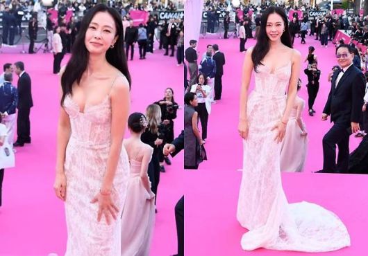 특히 긴 트레인으로 이어진 드레스 밑단은 한 걸음 한 걸음마다 우아한 여운을 남겼고, 자연스럽게 흐른 블랙 웨이브 헤어는 홍수현 특유의 클래식한 매력을 배가시켰다. 실루엣, 디테일, 분위기까지 모두 갖춘 이번 룩은 칸 현장을 물들이기에 충분했다.