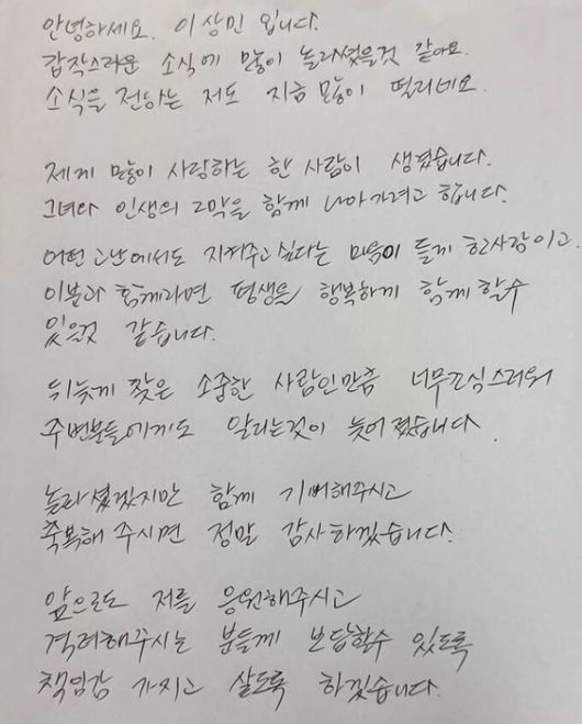 지난달 30일 이상민이 전격 재혼을 발표했다. 개인 SNS를 통해 자필 손편지를 공개한 그는 "많이 사랑하는 한 사람이 생겼다", "어떤 고난에도 지켜주고 싶다는 마음이 들게 한 사람"이라며 예비신부에 대해 각별한 애정을 표현했다.