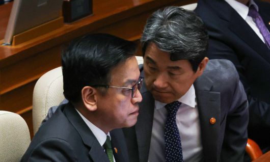 1일 서울 여의도 국회에서 열린 제424회 국회(임시회) 제7차 본회의에서 최상목 경제부총리 겸 기획재정부 장관과 이주호 사회부총리 겸 교육부 장관이 대화하고 있다. 뉴시스 |