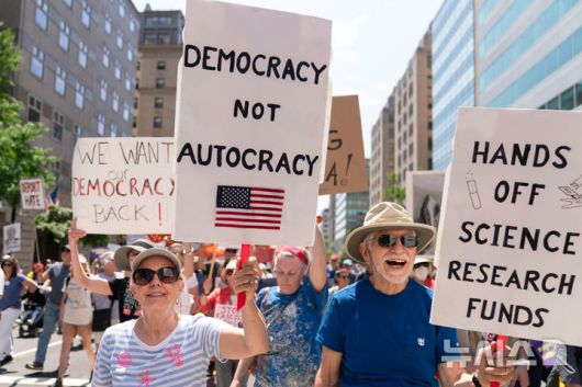[워싱턴=AP/뉴시스]국제 노동절인 1일(현지 시간) 미국 전역에서는 도널드 트럼프 행정부에 반대하는 집회가 동시다발적으로 벌어진 가운데, 미국 워싱턴DC 백악관 인근에서 트럼프 대통령을 비판하는 구호를 든 집회 참가자들이 행진하고 있다. 2025.05.02. |