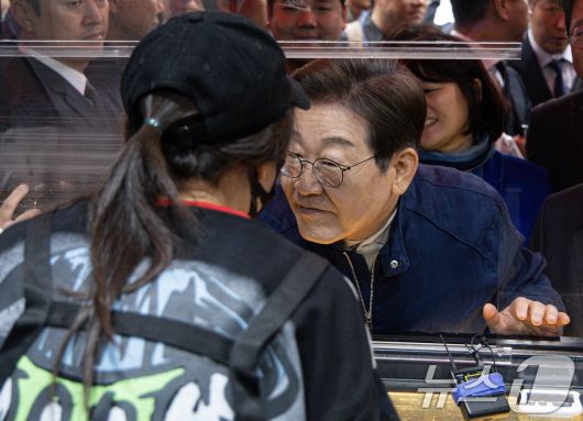 이재명 더불어민주당 대통령 후보가 1일 오후 경기도 포천시 신읍사거리 일대에서 치킨집 사장과 대화를 하고 있다. 2025.5.1/뉴스1 ⓒ News1 이재명 기자 |