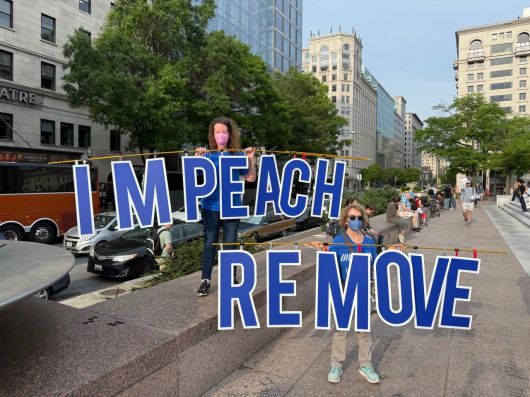 '탄핵'이라고 쓰인 홍보물을 들고 시위 현장에서 만난 도나 디킨슨(왼쪽)씨는 "트럼프는 탄핵돼야 한다"고 말했다. /박국희 특파원 |